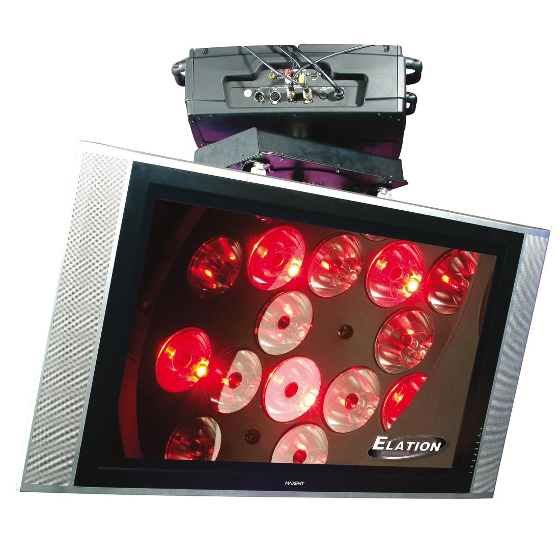 The “Media Base” can turn continuously 360 degr in micro steps (16bit resolution) and has a built-in sortiment of Video connectors and AC power supply (CEE 7/7 socket). The max load of additional 50kg makes it suitable for rotating big screens and other heavy loads. Rotation is possible in both directions. Speed is adjustable by DMX.