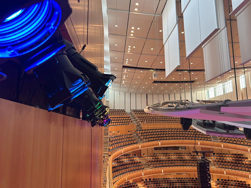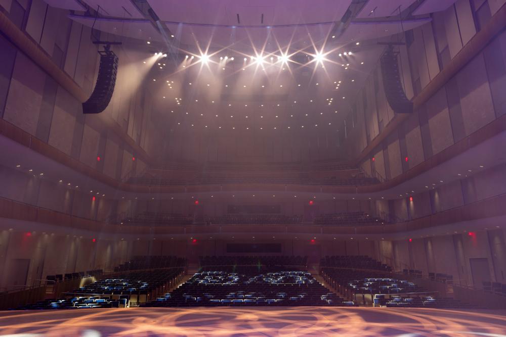 The KL CORE IP's high-quality light source offers a CRI of 94.9 and 16-bit CCT control from 2,400K to 8,500K, providing precise color consistency and tunable white light. The orchestra requires high lighting positions, and at the Holland Center, where the FOH position is 80' away, each fixture's 15,000-lumen output ensures bright, even coverage across the large stage.