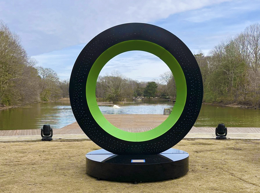 Also launching January 21 and glowing green from Elation SIXPAR fixtures were Aurora Portals, circular installations placed in high-visibility community locations. Each portal featured a scannable QR code linking to stories of innovation and discovery, with the circular form symbolizing Emory Healthcare's commitment to care at every stage of life and inviting visitors to experience a unique event space.