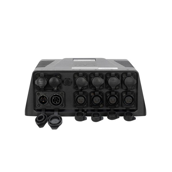 Features include a rugged IP65 housing, easy keyhole slots for wall and surface mounting, multiple DMX control modes, an onboard 4 button touch control panel, 8x 4pin locking output sockets, DMX 5pin locking XLR in/out and locking power in/out.